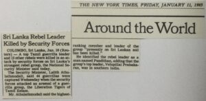 Its caption was ‘Sri Lanka rebel leader killed by Security Forces’. To quote, “A top Tamil guerrilla leader and 13 other rebels were killed in an attack by security forces on Sri Lanka’s strongest rebel group, the National Security Minister said today. The Security Minister, Lalith Atthulathmudali, said 44 guerrillas were captured Wednesday when the security forces attacked an arsenal of a guerrilla group, the Liberation Tigers of Tamil Eelam.