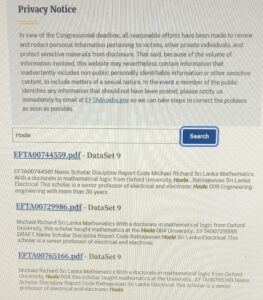 I’m not sure what the abbreviation SRF stands for. It may be Senior Research Fellow, or something else as a code word, which Jeffrey Epstein could comprehend. This SRF abbreviation is also used for other mentioned scholars – Maimul Khan (“Thanks to SRF”), Prosper Nobirabo (“An SRF fellowship in October 2005, renewed in 2007, supported this scholar’s independent research…”), Saad Eddin Ibraham (“The SRF awarded a fellowship…”), Hadi Hadizade Yazdi (“In 2004, the SRF arranged a position for him at Ohio University…”), Javad Tabatabai (“With SRF support for a fellowship at Syracuse University’s…”), Shemeem B Abbas (“The SRF awarded her a fellowship in February 2004 at the University of Texas…”). My guess is, this ‘SRF’ program of funding for scholars was sponsored by one of Epstein’s tentacles in the American academia. As such as, Rajan Hoole, and six other scholars were beneficiaries of this SRF program.