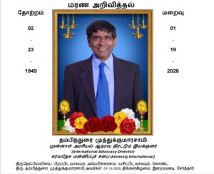 Thambithurai Muthukumarasamy was born on Feb. 23, 1949, one of eight children of Thambiturai Muthukumaraswamy and Maruthapraveegavalli Muthukumaraswamy.
