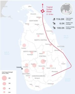 Housing damage remains extensive, with nearly 6,000 houses fully destroyed and over 108,000 houses partially damaged. In response, temporary camps have been observed in the Badulla, Kegalle, and Nuwara Eliya districts, while reports also indicate the emergence of informal and scattered displacement sites.
