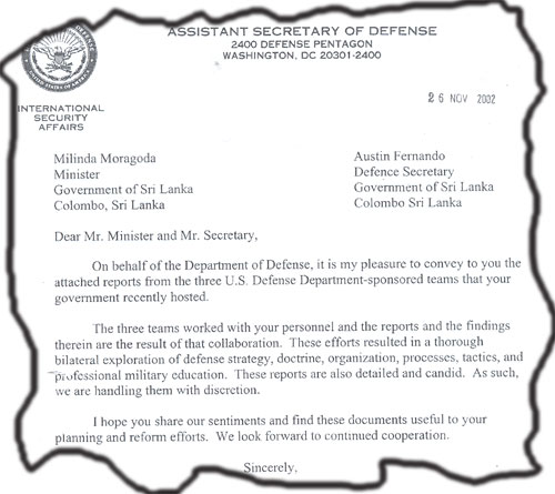 The result of this study was a top secret report, which was signed by Peter W.Rodman on behalf of the International Security Affairs desk of the US Department of Defense. Copies of this report were given only to the then Prime Minister, Ranil Wickremasinghe, the Defense Minister Tilak Marapone, and the Secretary Defense Austin Fernando. The then President Chandrika Kumaratunga, and the cabinet were kept in the dark about this study. What follows are verbatim extracts from this report....