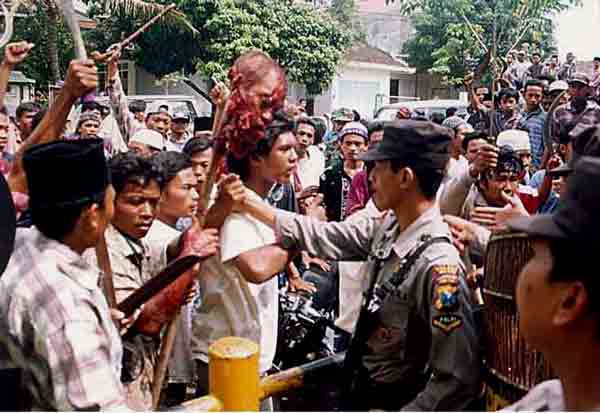 An Indonesian soldier congratulating pro-Indonesian militiamen, displaying a severed head